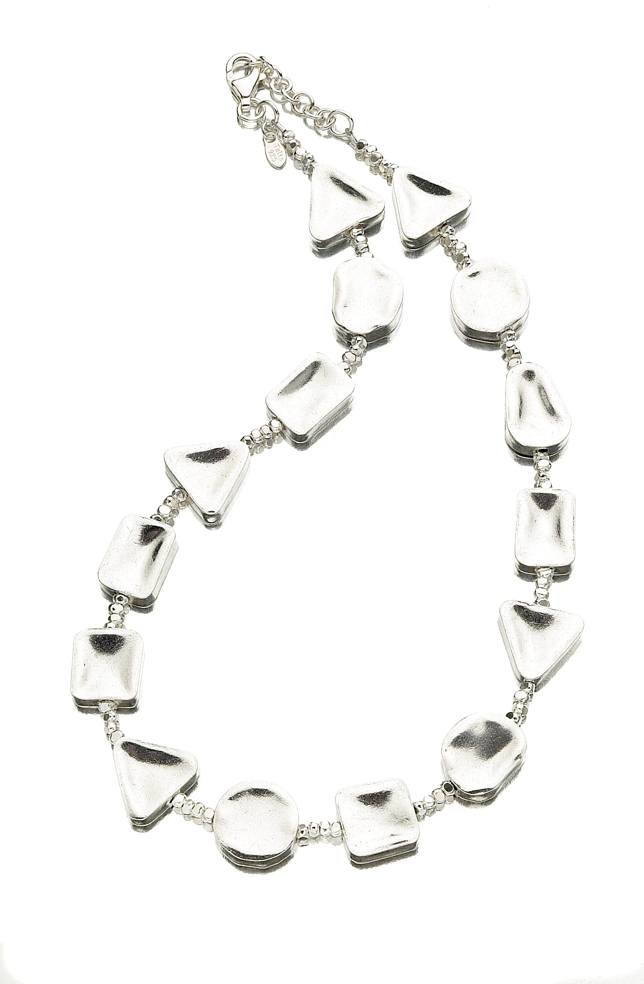 Our Pebblestone beads are alternating with six different styles of geometric beads. The beads are brightly reflective sterling silver. This effect creates an urban contemporary presence that can be worn for work and play.