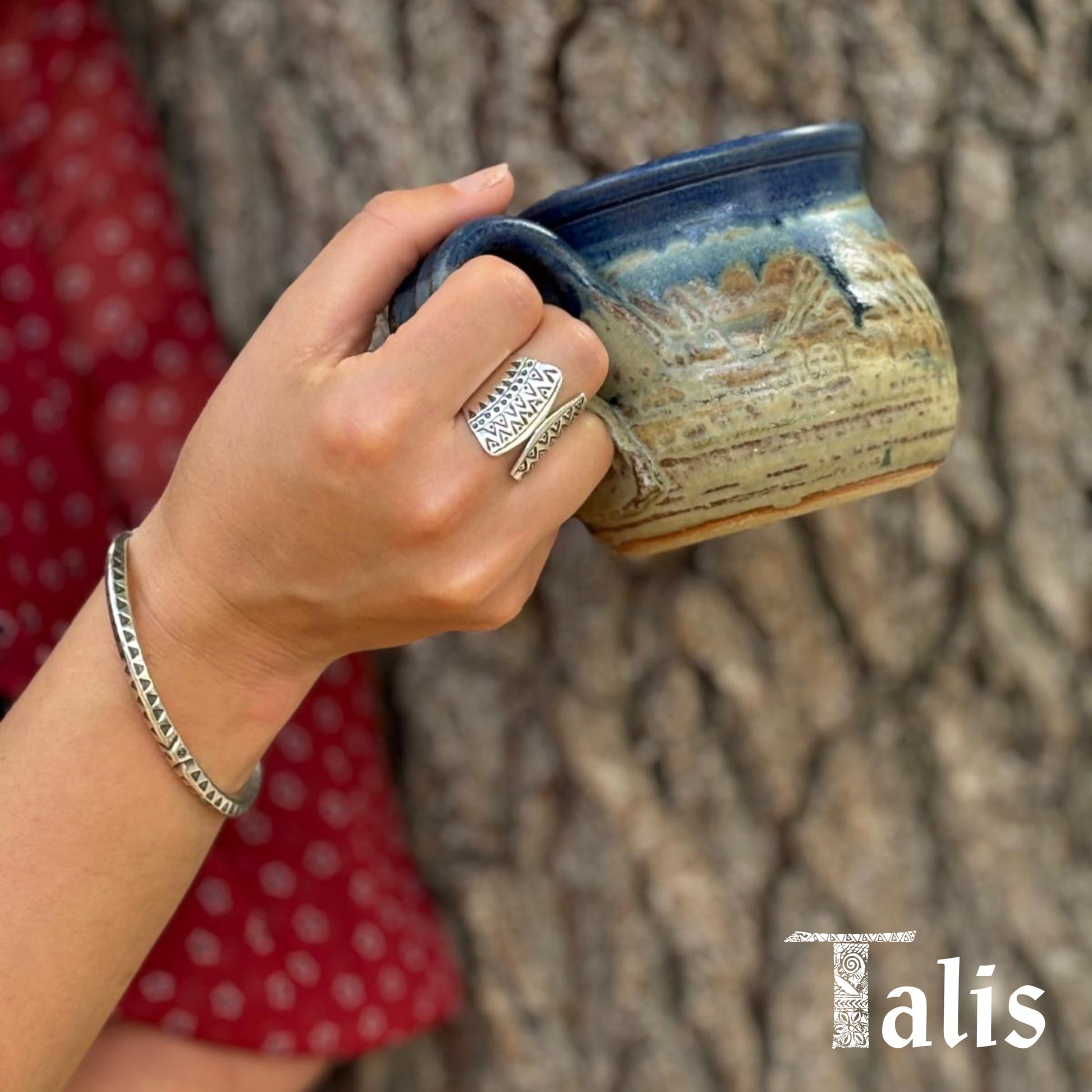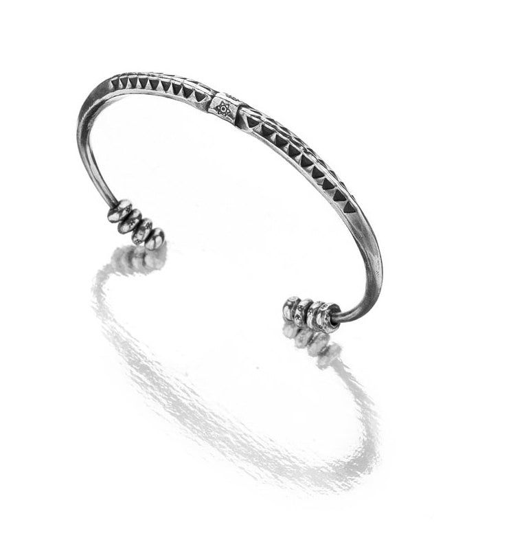 Our ethically sourced, handcrafted silver bracelet is meticulously stamped with traditional Karen hill tribe designs and oxidized to enhance the details. It's smooth and rounded with three movable beads at each end, which adds a playful element to it. Because of its substantial weight and sturdiness, it's quite popular with men. People with skin sensitivities will be pleased to know that it's made from non-allergic, nickel-free sterling silver.
