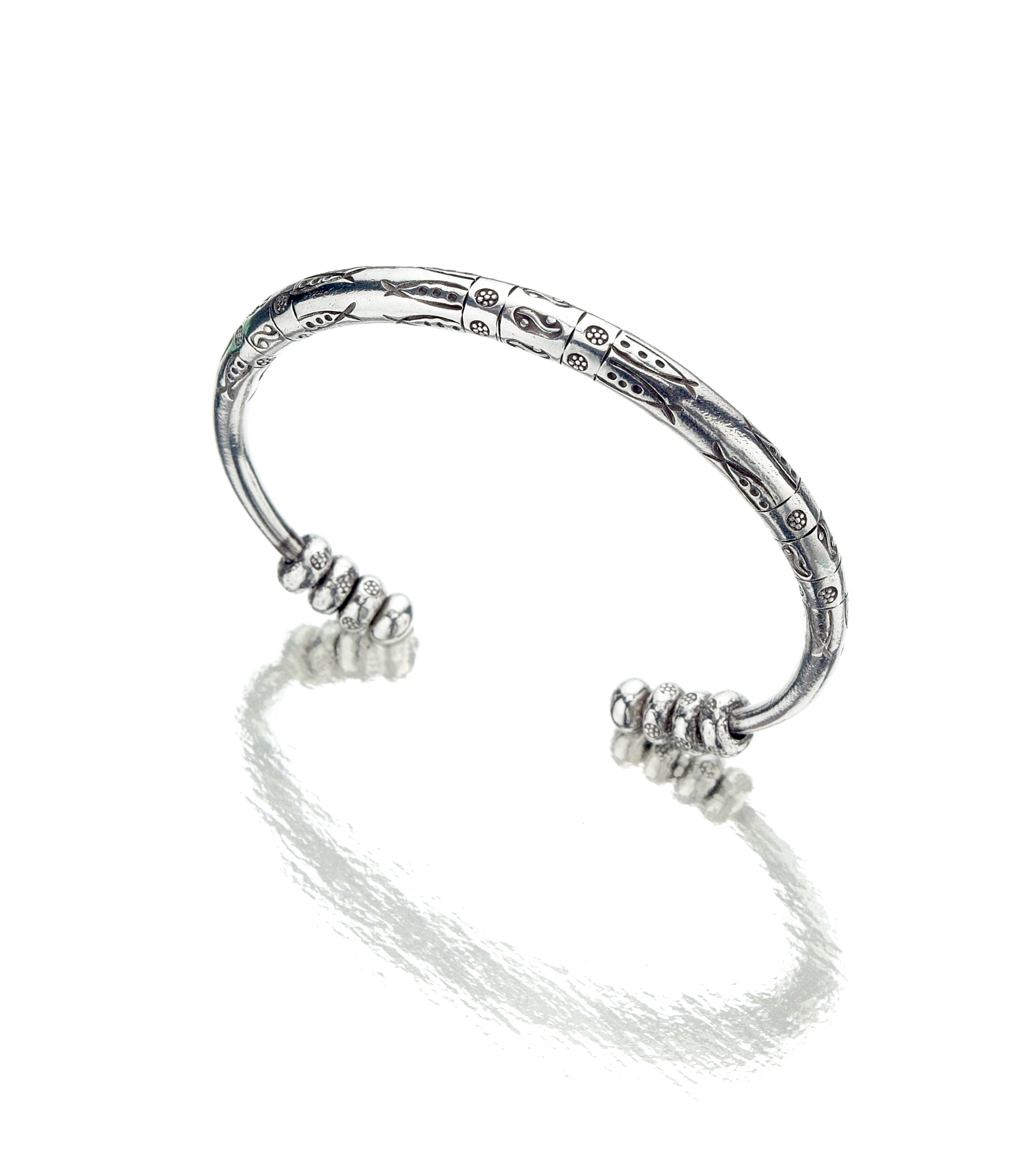 Our ethically sourced, handcrafted silver bracelet is meticulously stamped with traditional Karen hill tribe designs and oxidized to enhance the details. It's smooth and rounded with three movable beads at each end, which adds a playful element to it. Sturdy and substantial, it's suitable for daily wear. All of Talis jewellery is made from non-allergenic, nickel-free sterling silver.