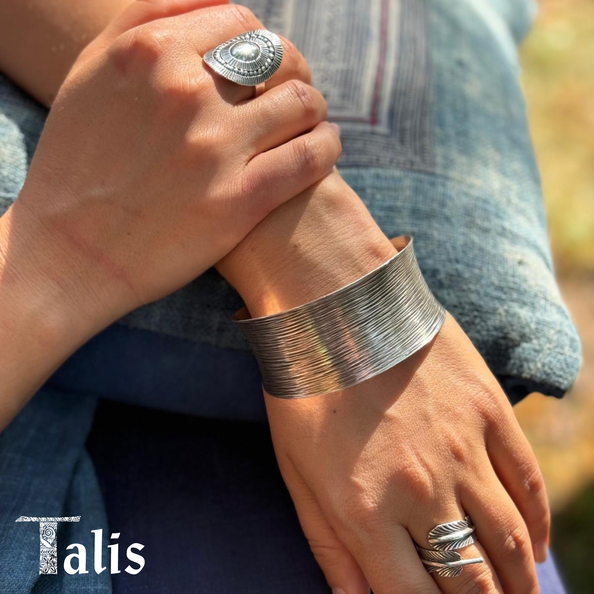Our Grooved Cuff Bracelet is stamped with traditional Karen hill tribe line design and oxidized to enhance the details. Made from fine silver, our bracelets are nickel-free, so people who have sensitivities will be comfortable wearing them.