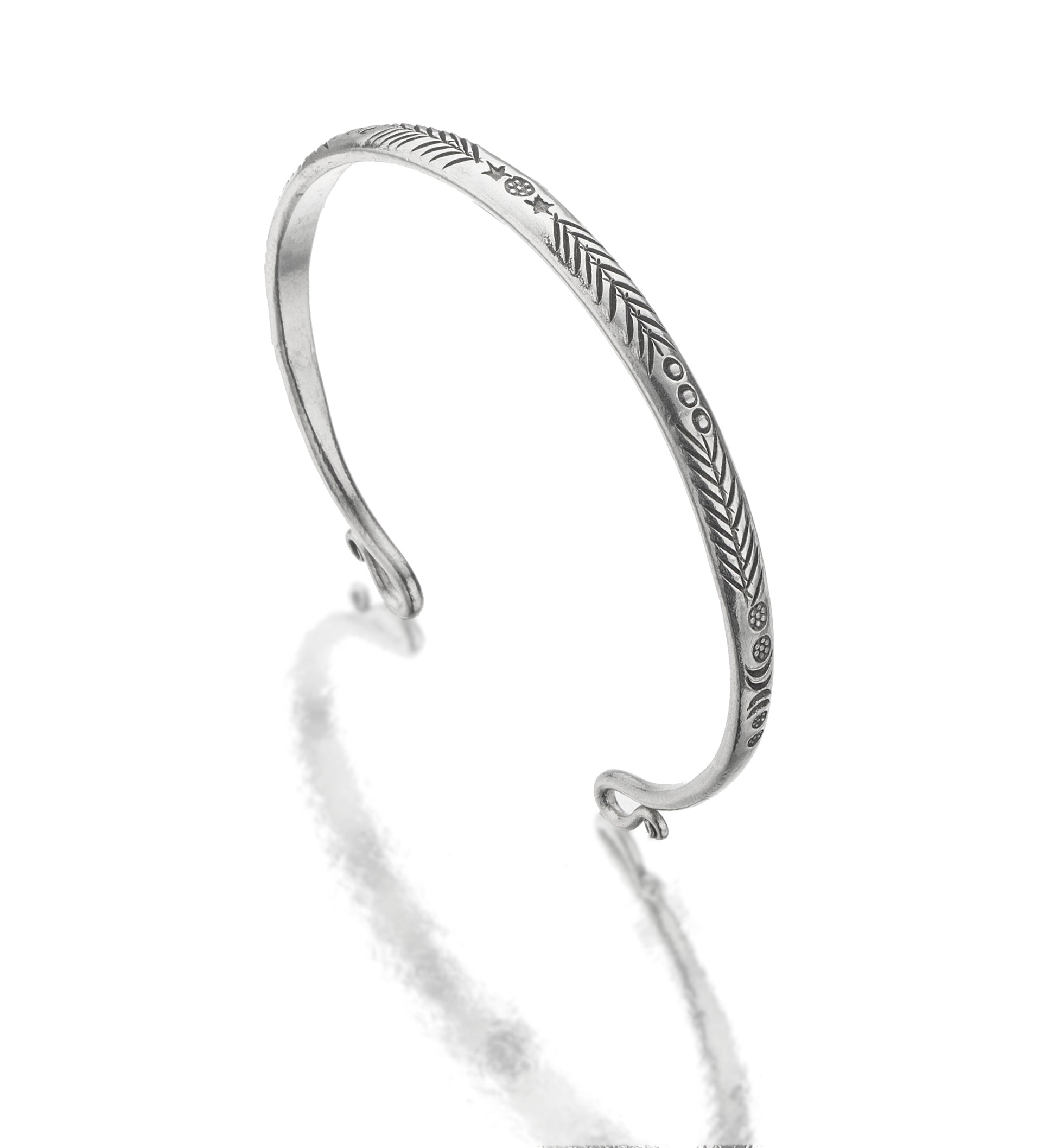 Our ethically sourced, handcrafted sterling silver bracelet is intricately stamped with traditional Karen hill tribe designs and oxidized to enhance the details. Each end is completed with a gracefully curved S-loop. People with skin sensitivities will be pleased to know that all of Talis jewellery is made from solid, non-allergenic, nickel-free silver.