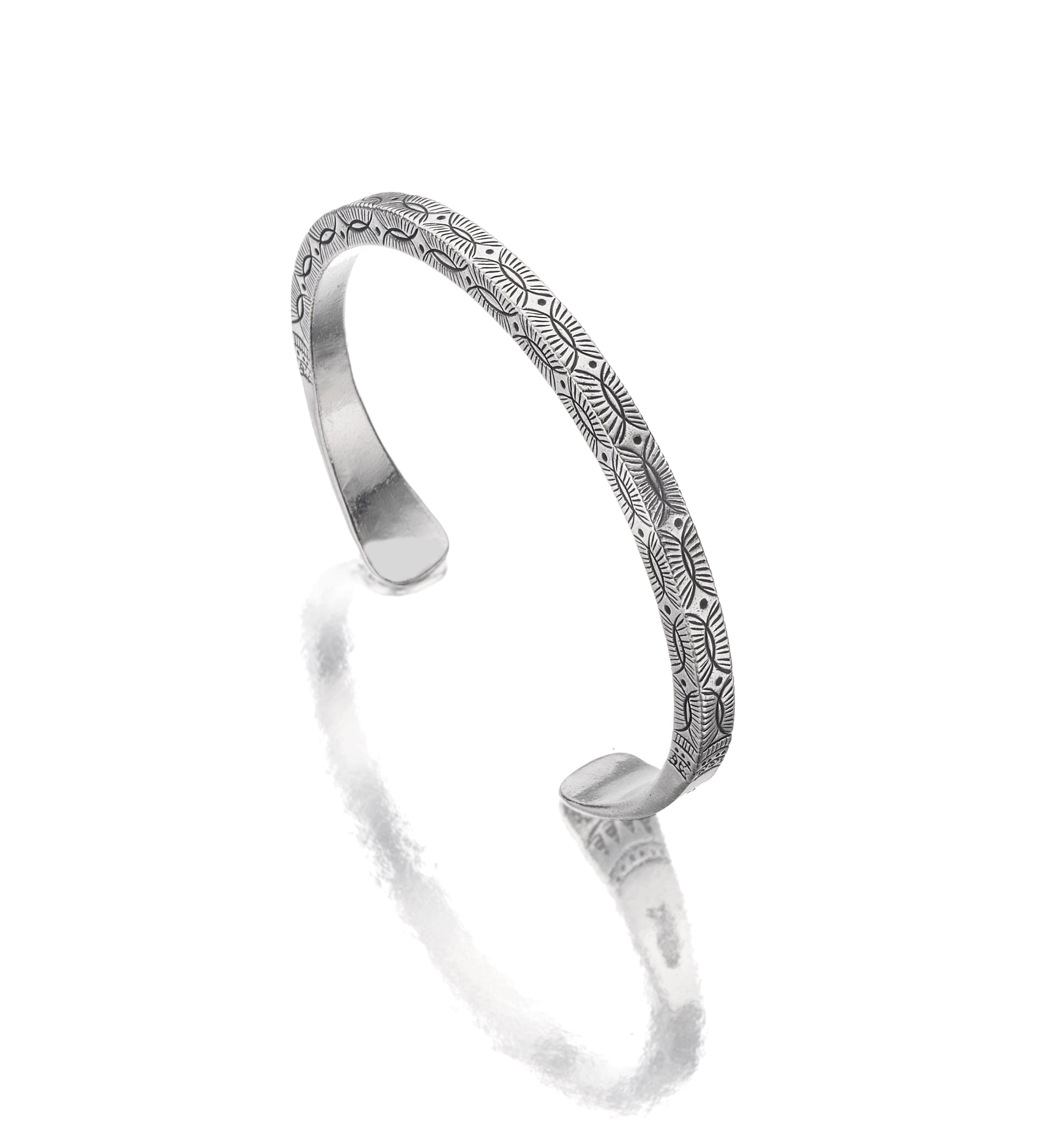 Our ethically sourced, handcrafted fine silver bracelet is meticulously stamped with traditional Karen hill tribe designs and oxidized to enhance the details. It's suitable for daily wear and made from solid, non-allergic, nickel-free silver.