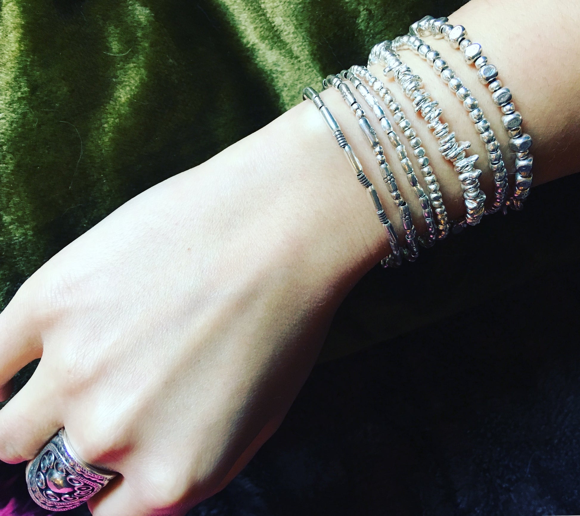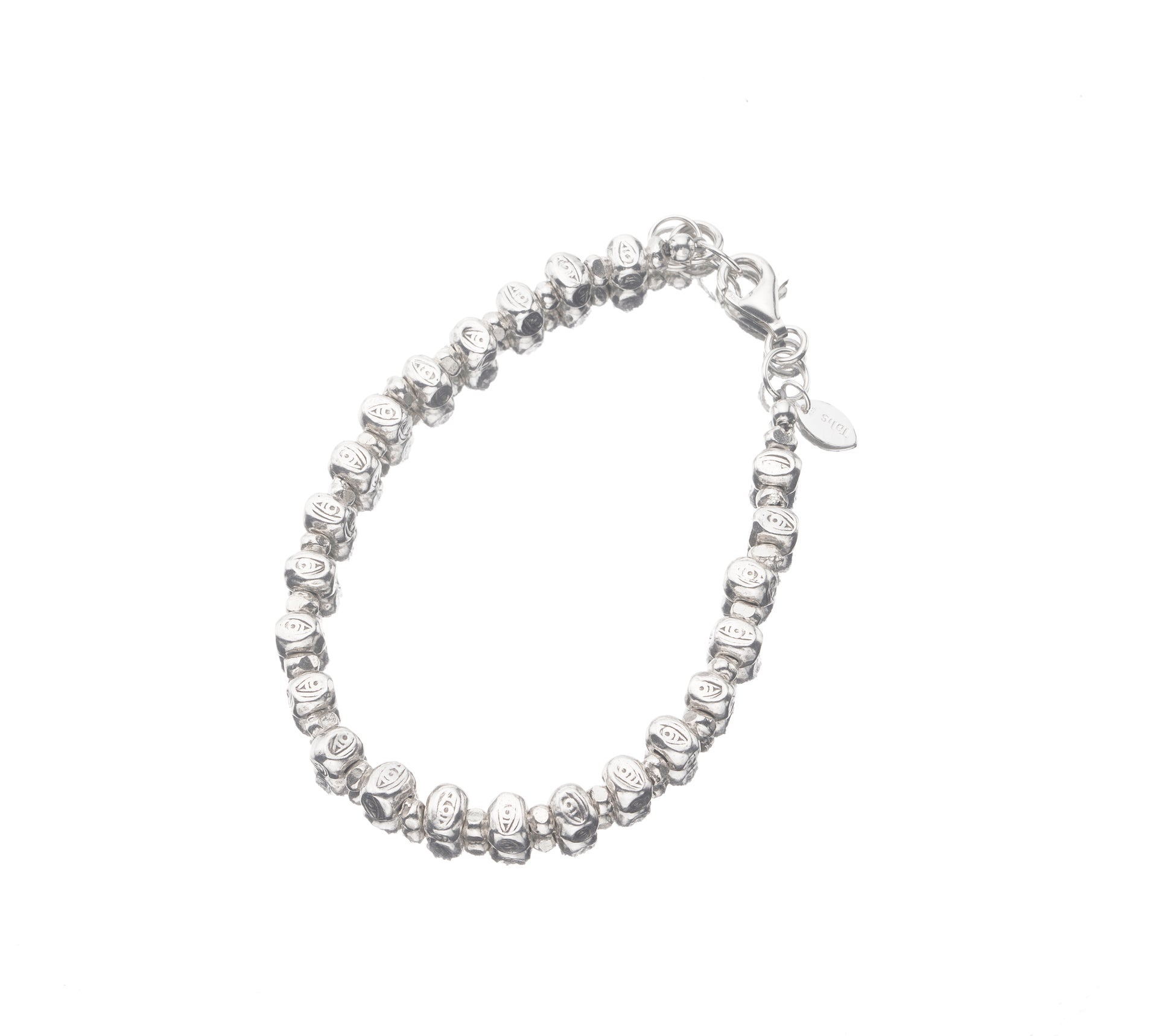 Our Mystic Eye Bracelet is made of Mystic Eye beads alternating with Pebblestone beads. The Pebblestone bead is brightly reflective, solid silver that is tumbled and faceted. This effect creates an elegant, light-dappled, organic presence which contrasts really well with the oxidized Mystic Eye bead.