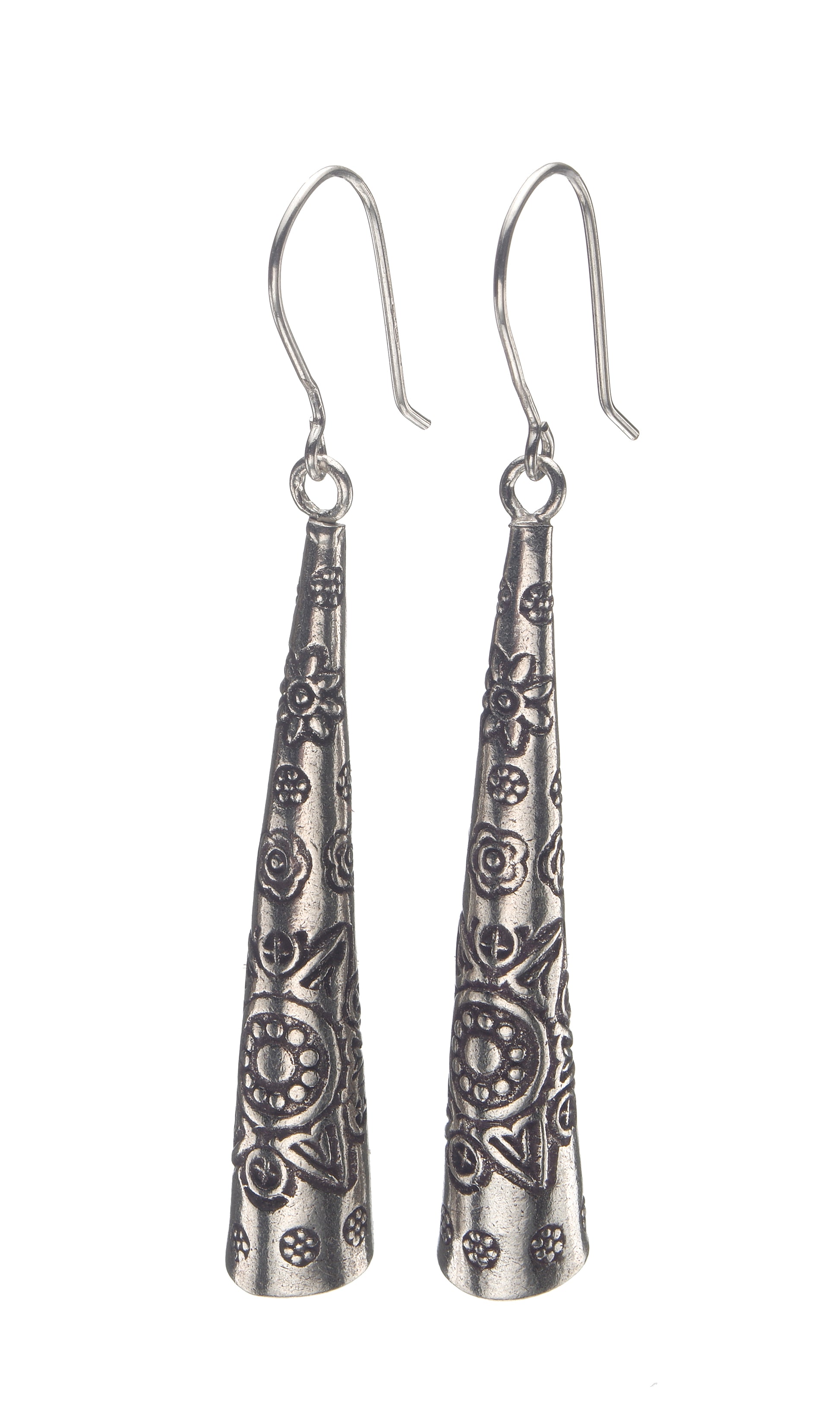 Our Trumpet Flower Earrings are stamped with traditional Karen hill tribe flower designs and oxidized to enhance the details. Our earrings are made from non-allergenic, nickel-free fine silver, so people with sensitivities will be comfortable wearing them.