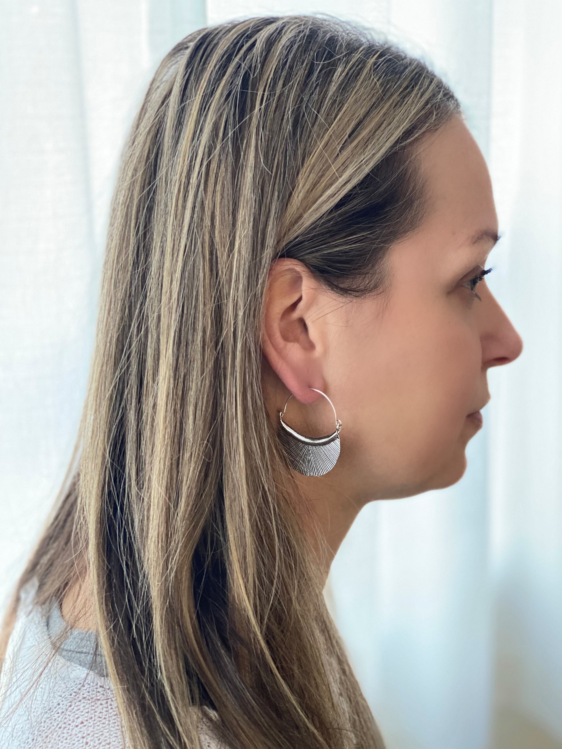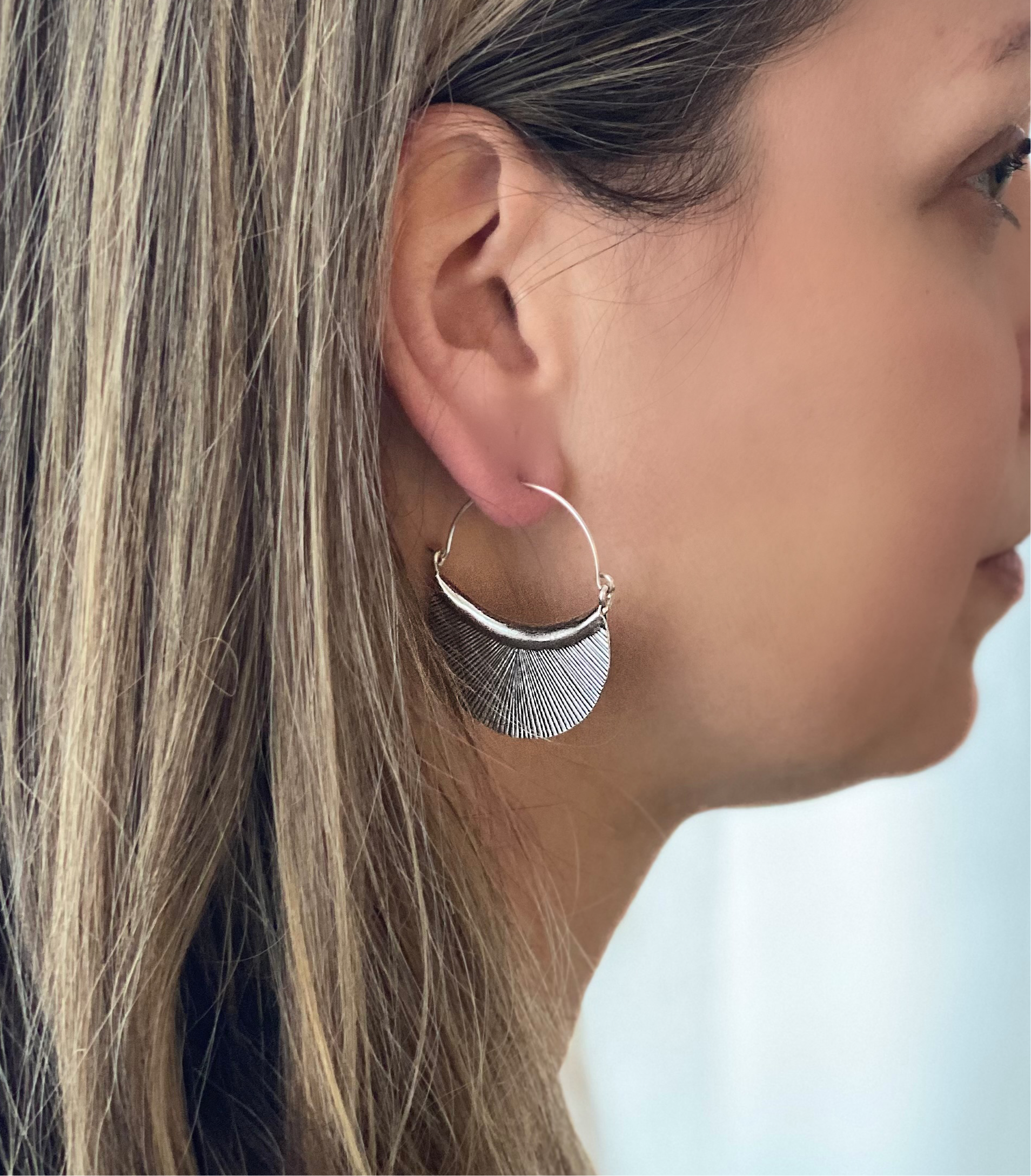 Our Palm Frond Earrings are stamped with traditional Karen hill tribe texture design and oxidized to enhance the details. Made from fine silver, our earrings are nickel-free, so people who have sensitivities will be comfortable wearing them.