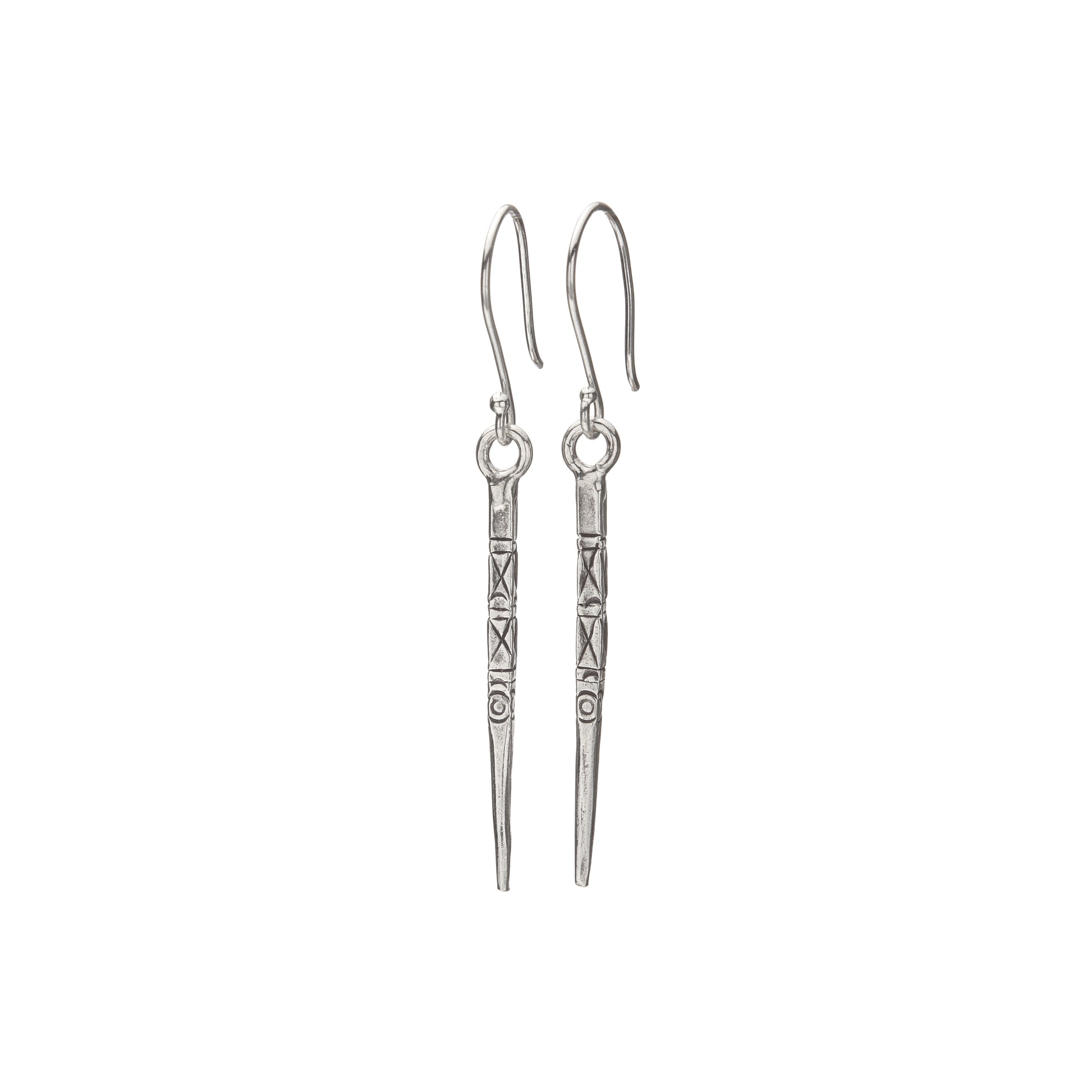 Our Huntress Earrings are meticulously stamped with traditional Karen hill tribe designs and oxidized to enhance the details. Made from fine silver, they are nickel-free, so people with sensitivities will be comfortable wearing them.