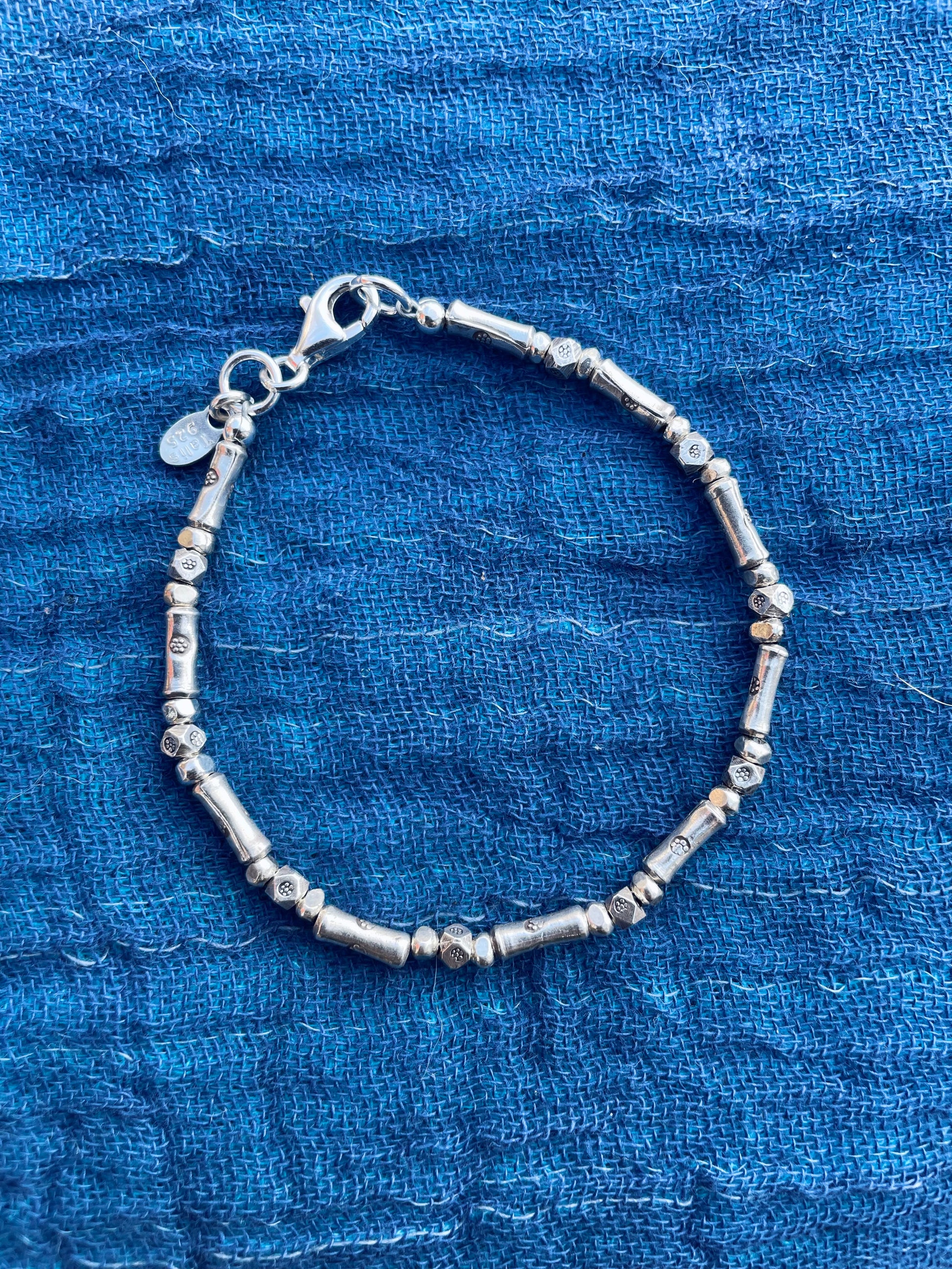 Our one of a kind beaded bracelet #5 is a traditional Karen hill tribe design. The beads have been faceted and stamped with tiny flowers representing blessings and then oxidized to enhance the stamped details. The brightly reflective pebblestone beads in between add an elegant, light-dappled, organic presence. People with skin sensitivities will be pleased to know all of Talis jewellery is made of non-allergenic, nickel-free sterling silver.