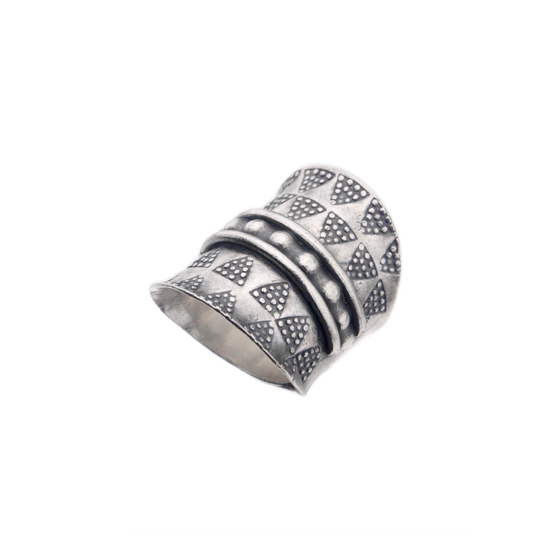 Our Armour Ring is stamped with traditional Karen hill tribe designs and oxidized to enhance the details. It is made from non-allergenic nickel-free fine silver, so people with sensitivities will be comfortable wearing it.
