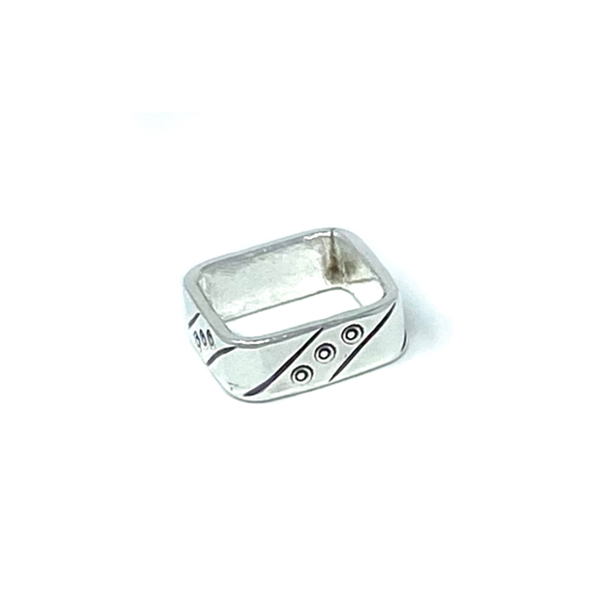 Our Squared Circle Ring is stamped with traditional Karen hill tribe designs and oxidized to enhance the details. People who have sensitivities will be pleased to know that all of our rings are made from non-allergenic nickel-free fine silver.