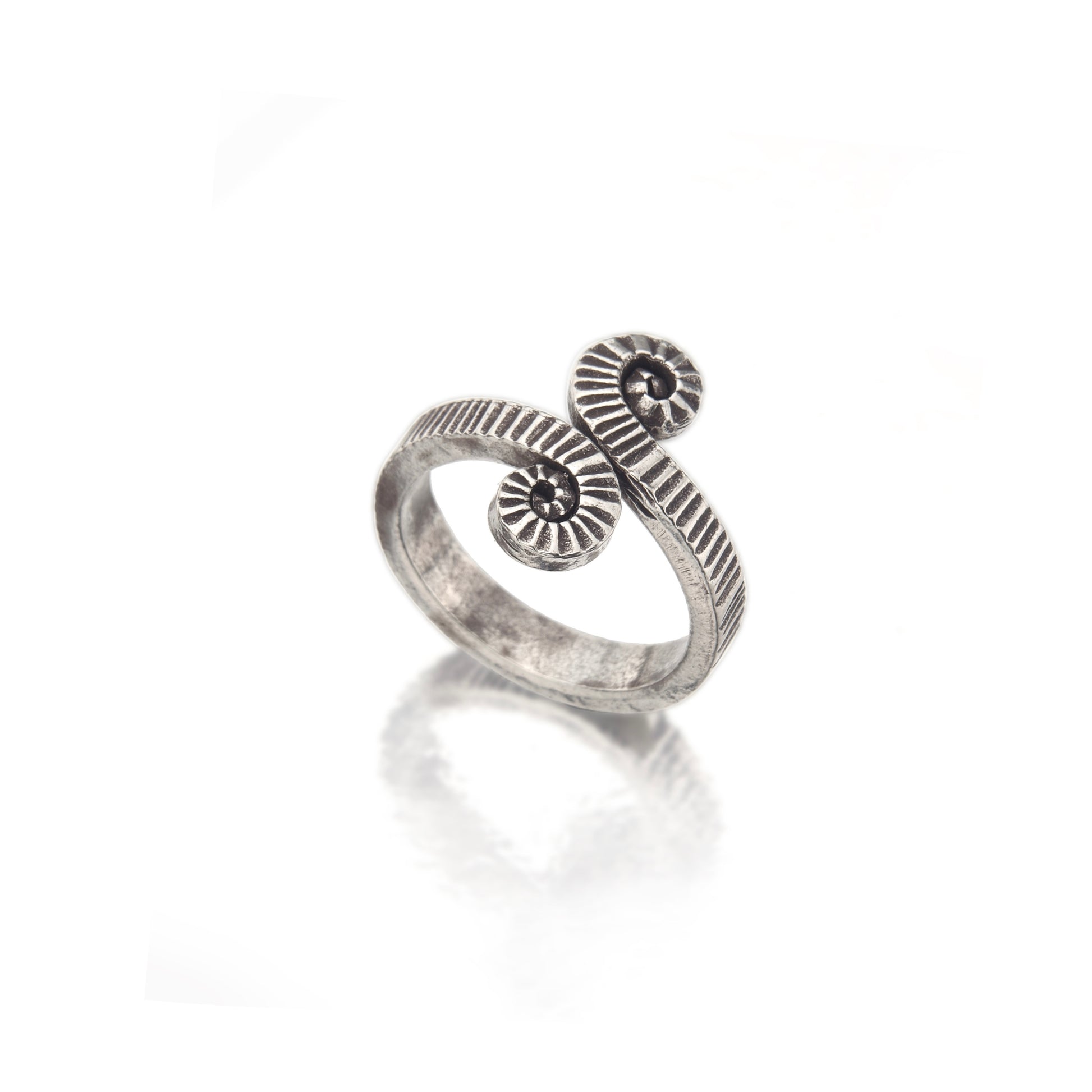 Our Twin Coiled Fern Ring is stamped with traditional Karen hill tribe line designs and oxidized to enhance the details. All of our rings are made from non-allergenic nickel-free fine silver, so people with sensitivities will be comfortable wearing them.
