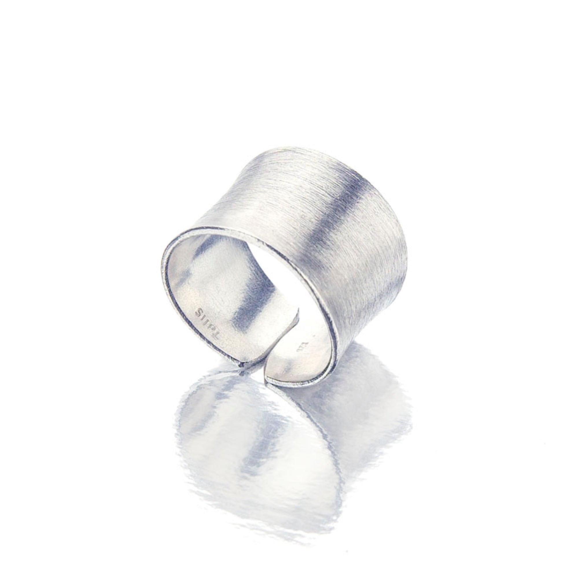 Our Glacial Ring is a bright brushed silver, which gives it an icy-like shimmer in the light. It is a modern design with a nod to a traditional shape. The ring slightly tapers towards the back and has a slight opening to allow for slight size fluctuation.